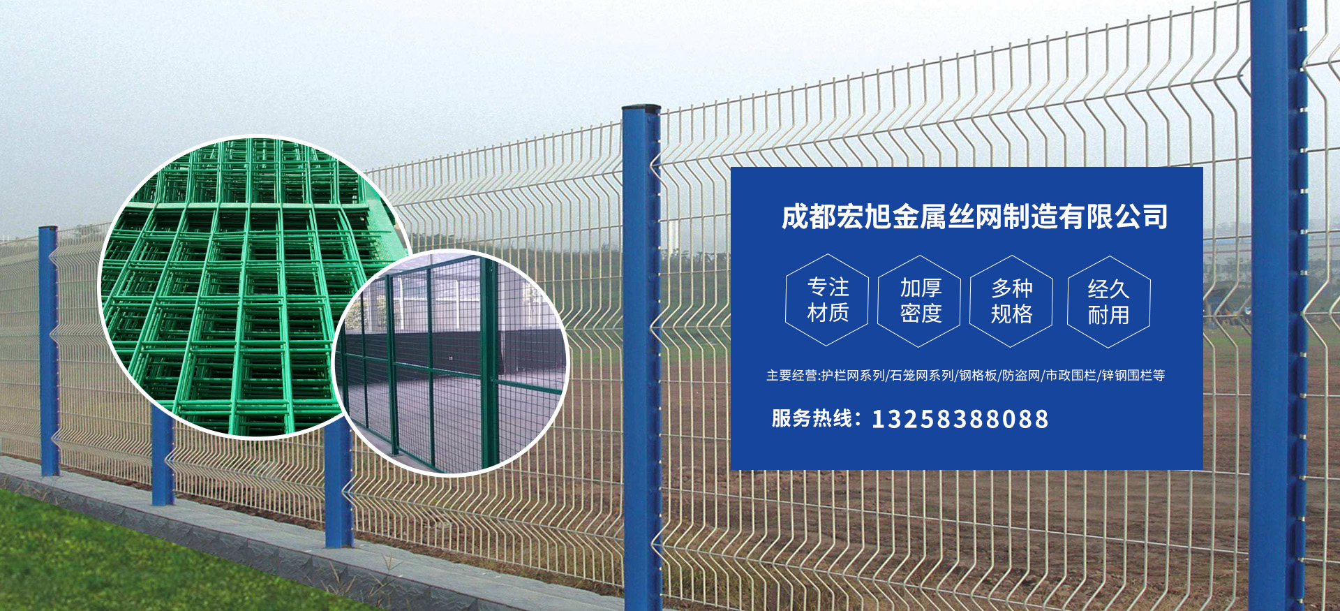 成都宏旭金屬絲網(wǎng)制造有限公司主營護(hù)欄網(wǎng)系列、石籠網(wǎng)系列、鋼格板、防盜網(wǎng)、市政圍欄、鋅鋼圍欄、鋼筋網(wǎng)片、聲屏障系列、波形護(hù)欄板、柔性纜索護(hù)欄、SNS邊坡防護(hù)網(wǎng)等其他絲網(wǎng)類產(chǎn)品。特殊規(guī)格可加工定做,也可根據(jù)客戶來圖來樣定做。自創(chuàng)業(yè)以來,公司一直堅(jiān)持市場(chǎng)為導(dǎo)向,以客戶為根本,以實(shí)業(yè)為基礎(chǔ),以技術(shù)為支持,以科研為后盾,集科研、生產(chǎn)、經(jīng)營為一體,不斷研制開發(fā)新產(chǎn)品,開拓市場(chǎng),走綜合發(fā)展之路。多年來,公司憑借過硬的質(zhì)量,良好的信譽(yù)、優(yōu)質(zhì)的服務(wù)、合理的價(jià)格,贏得了市場(chǎng)和商家的一致好評(píng)。